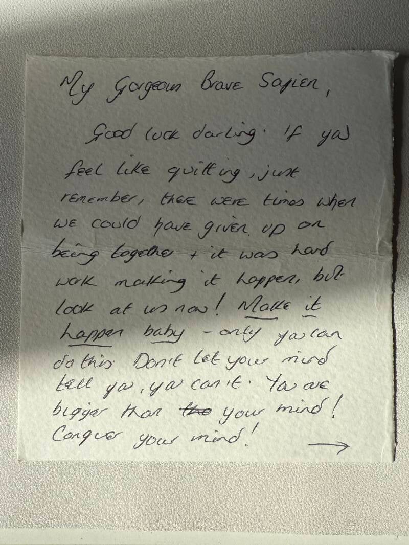 Saturday morning started with a calm 3-mile walk with Betty, a light breakfast, and a few litres of water to stay ahead of the heat. I arrived at the venue around 10 a.m., changed in the pit, and found a surprise note from Paula in my kit bag (see photo). It hit me right in the feels.